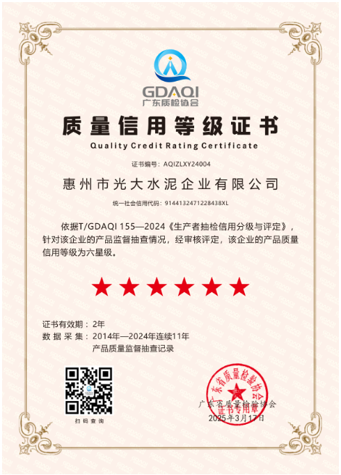 2025年3月17日,廣東省質(zhì)量檢驗(yàn)協(xié)會(huì)正式揭示了2024年度企業(yè)產(chǎn)品質(zhì)量信用等級(jí)評(píng)定結(jié)果,惠州市光大水泥企業(yè)有限公司憑借質(zhì)量信用建設(shè)方面的卓越表現(xiàn),榮獲廣東省市場(chǎng)質(zhì)量信用六星等級(jí)榮譽(yù)證書(最高等級(jí))。