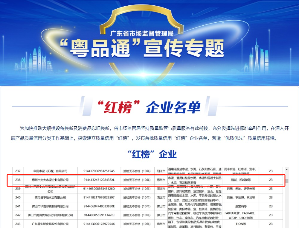 參與此質(zhì)量信用評(píng)定活動(dòng),前提條件是必須列入廣東省質(zhì)量信用“紅榜”企業(yè)名單中,光大水泥憑借卓越的產(chǎn)品質(zhì)量管控能力和出色表現(xiàn),連續(xù)十年在全國各級(jí)市場(chǎng)監(jiān)管部門組織的產(chǎn)品質(zhì)量監(jiān)督抽查中保持“抽檢無不合格”的記錄,成功躋身廣東省市場(chǎng)監(jiān)督管理局首批“工業(yè)產(chǎn)品質(zhì)量信用優(yōu)良企業(yè)榜單”,榮獲“十年榜”信用標(biāo)簽及 “企業(yè)質(zhì)量信用等級(jí)A級(jí)”稱號(hào)。